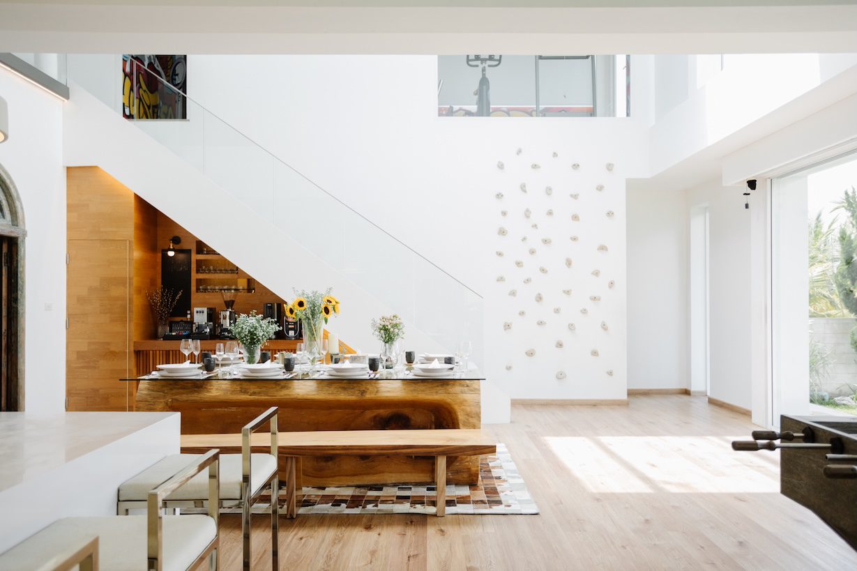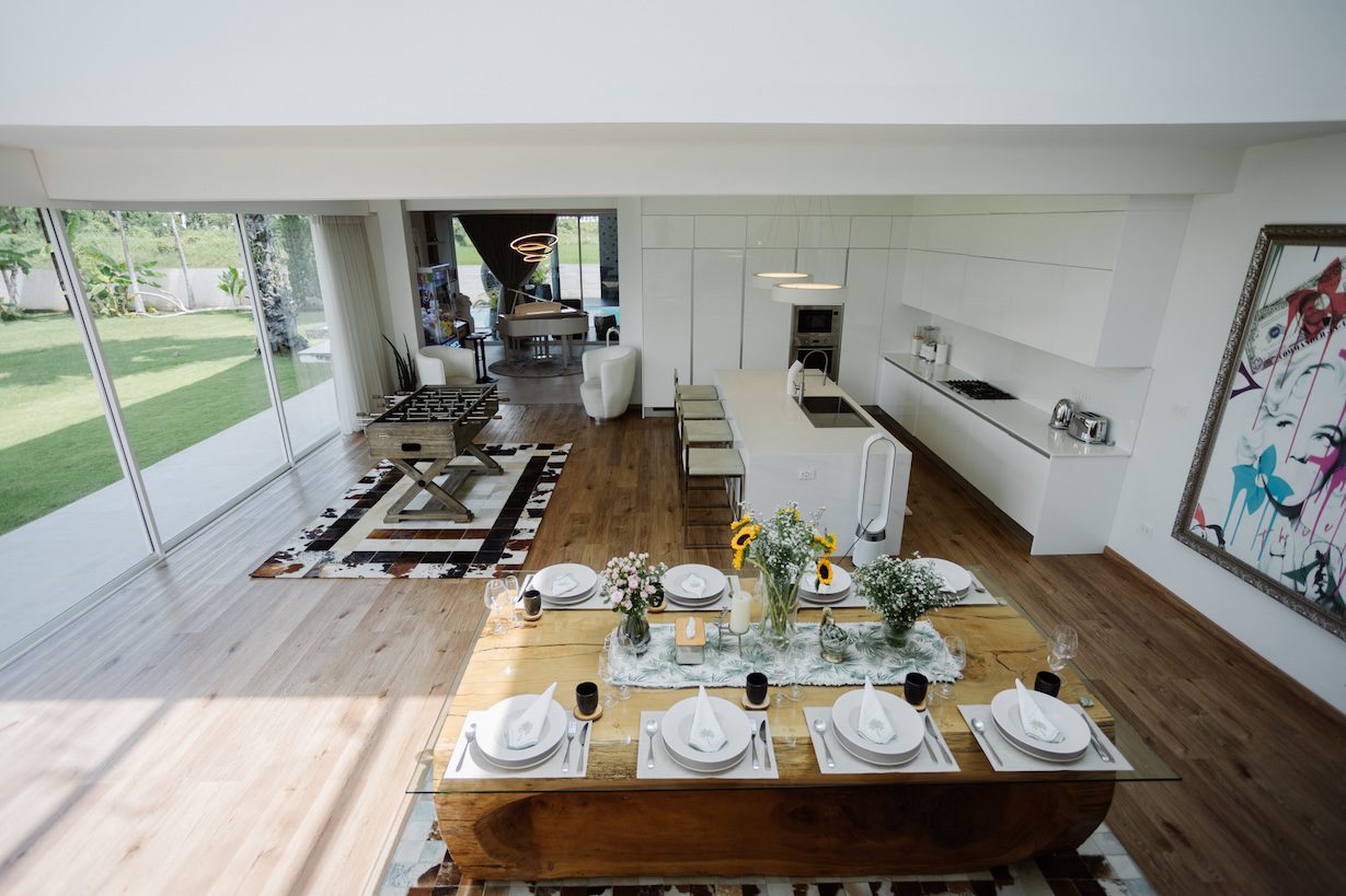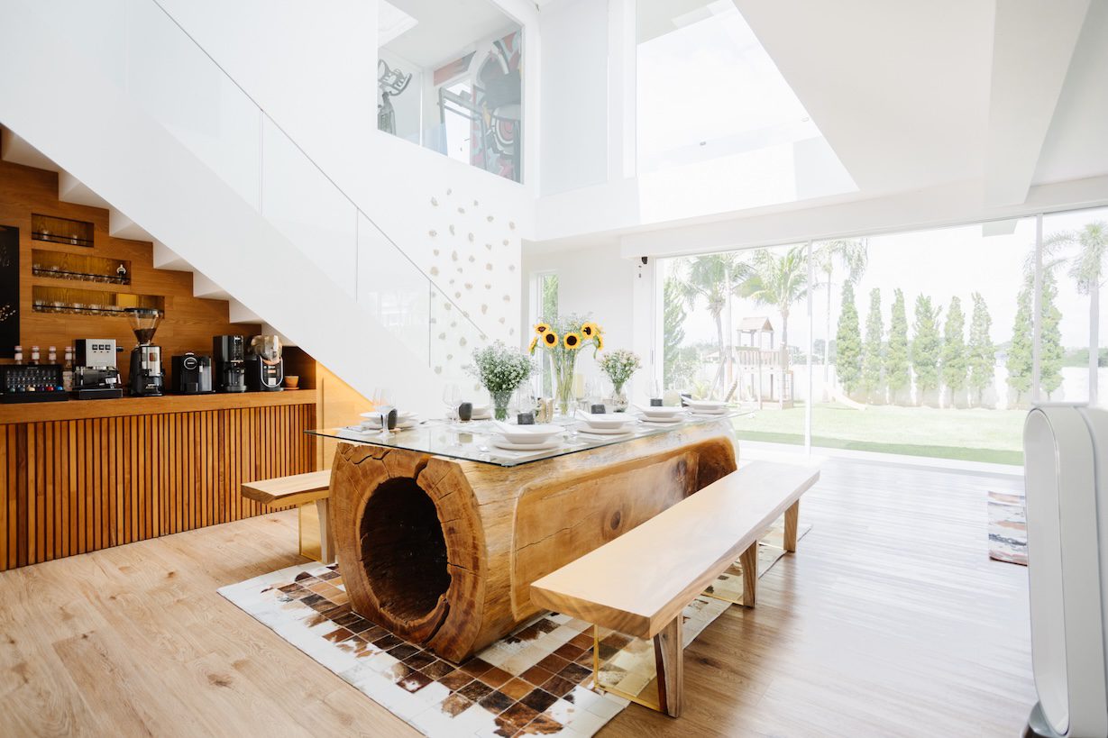 Our kitchen at Palm Villa is not just about functionality; it’s designed with a focus on communal dining and enjoying the beauty of our surroundings. Numerous seating areas ensure ample space for everyone, while a stunning tree trunk dining table takes center stage, positioned perfectly under the skylight. Here, you can indulge in your meals under the gentle glow of natural light.
