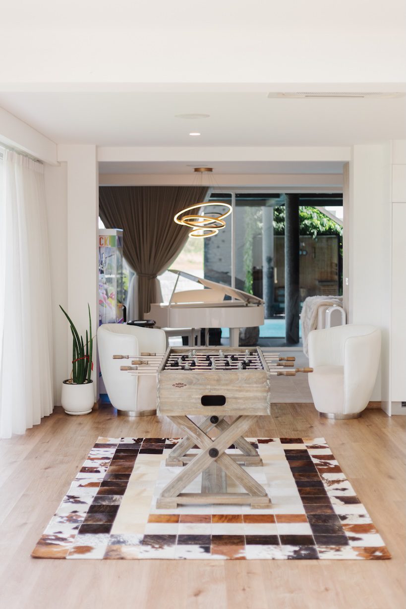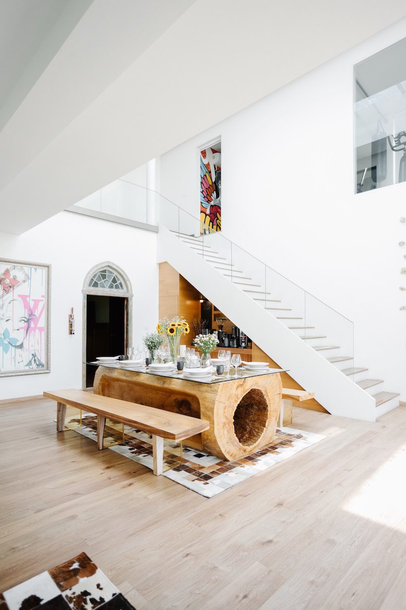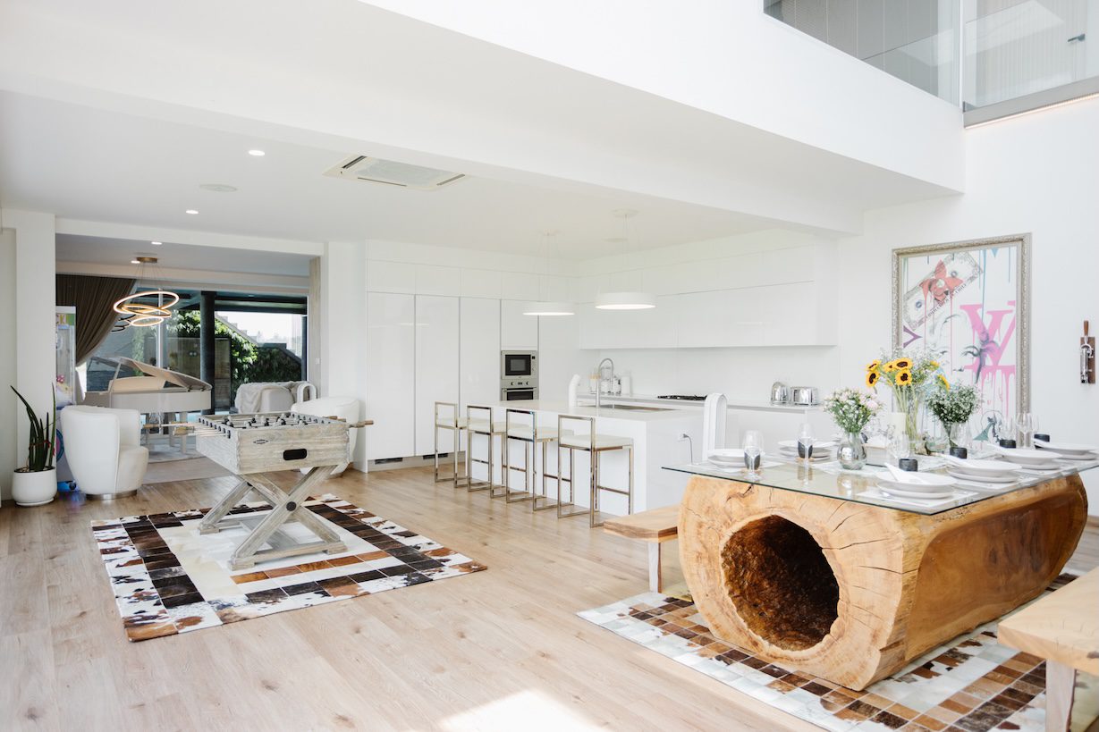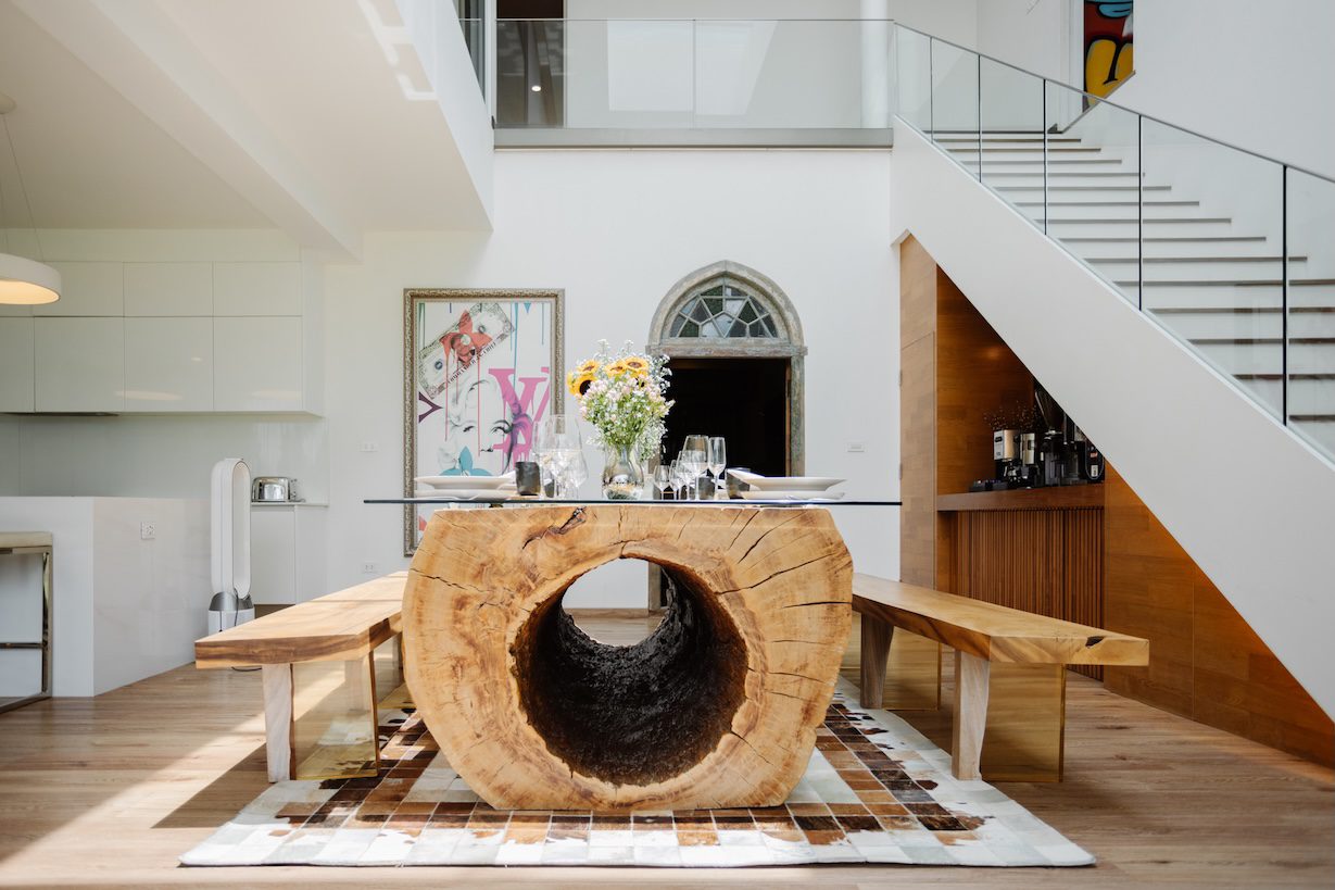 Our kitchen at Palm Villa is not just about functionality; it’s designed with a focus on communal dining and enjoying the beauty of our surroundings. Numerous seating areas ensure ample space for everyone, while a stunning tree trunk dining table takes center stage, positioned perfectly under the skylight. Here, you can indulge in your meals under the gentle glow of natural light.