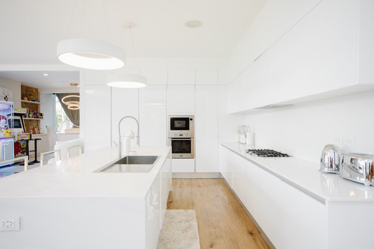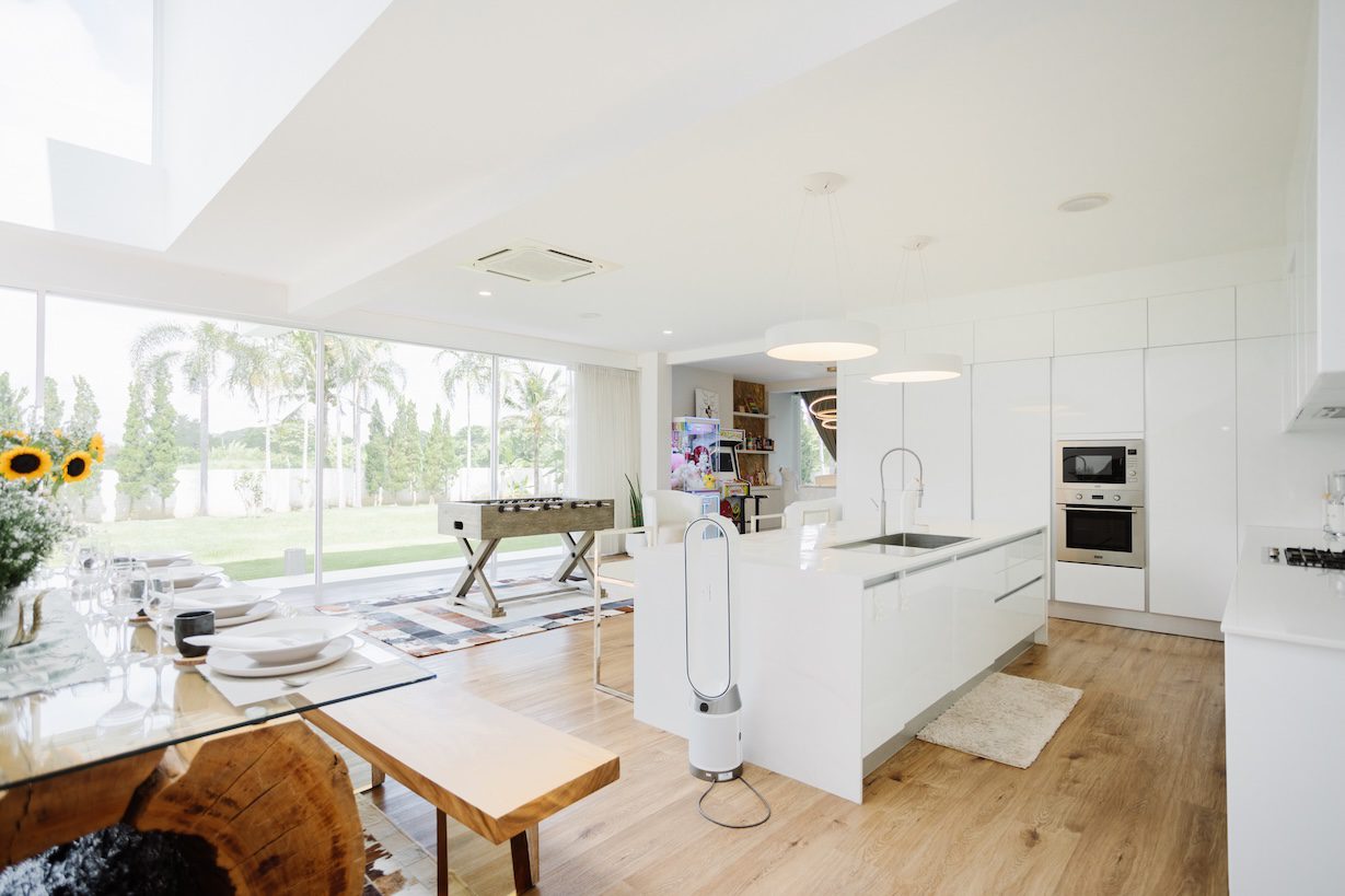 The kitchen boasts an open-plan design that merges indoor comfort with outdoor allure. Large sliding glass doors retract into the walls, eliminating barriers between you and the stunning vista beyond. This innovative design allows unobstructed views of the glorious sunrise and the tranquil garden, ensuring that nature is always a part of your culinary journey.