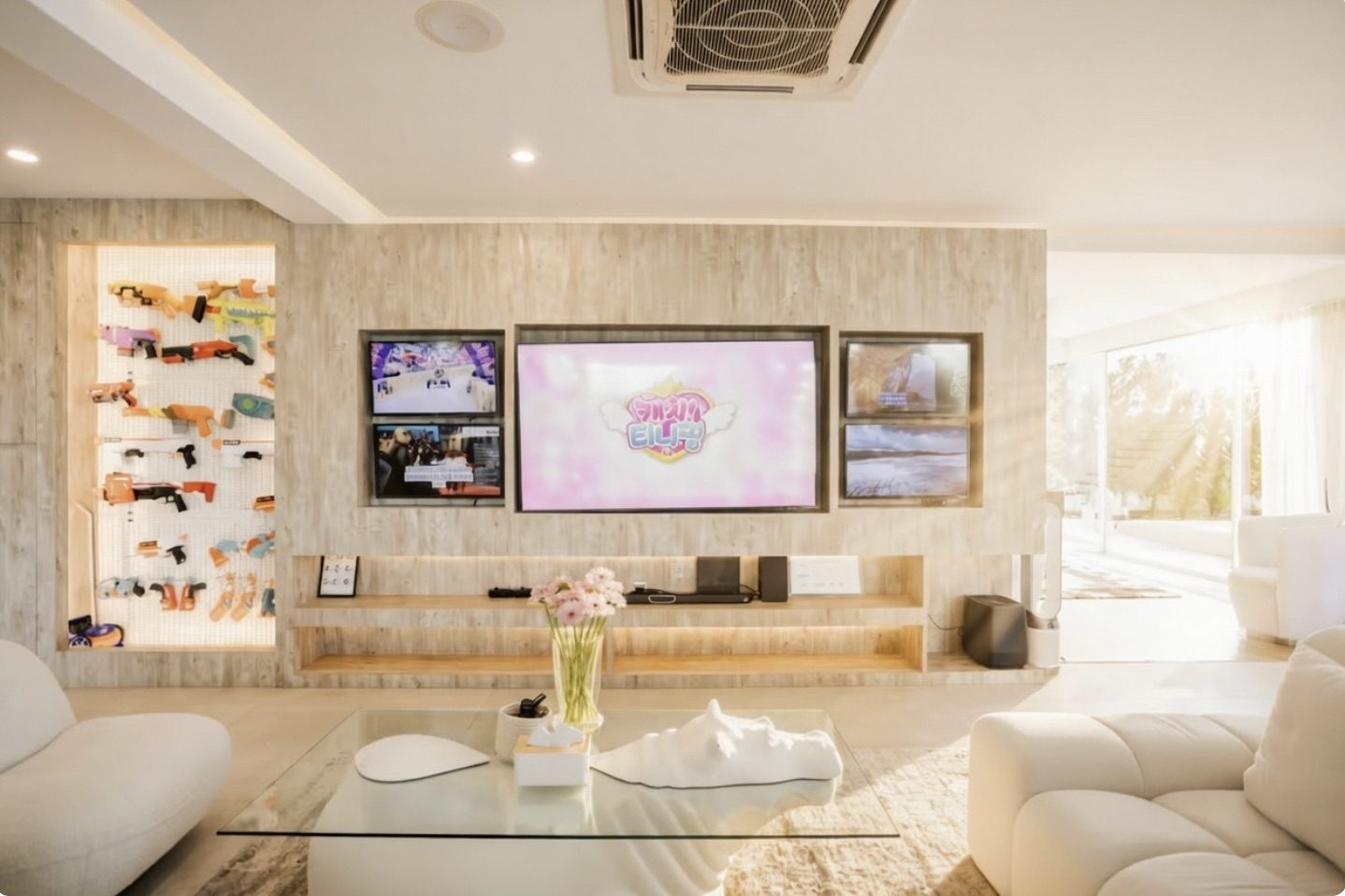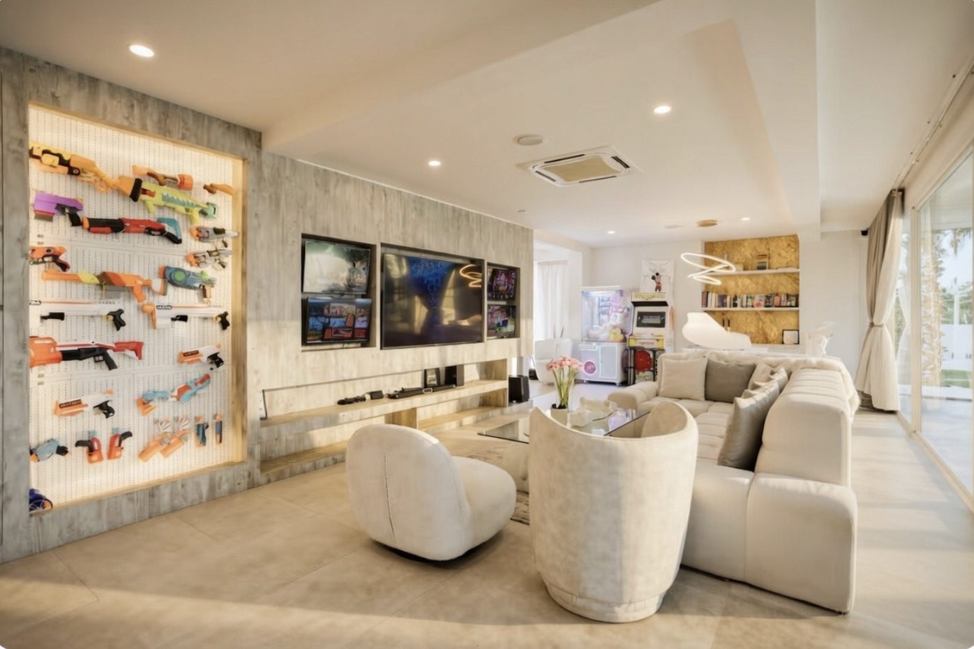 As you enter the living room, you are greeted by an impressive hallway adorned with a magnificent chandelier, casting a warm and inviting glow throughout the space. Adding a touch of playful nostalgia, vintage Playboy posters tastefully line the walls, infusing the room with a rockstar aura, igniting a sense of adventure and glamour.